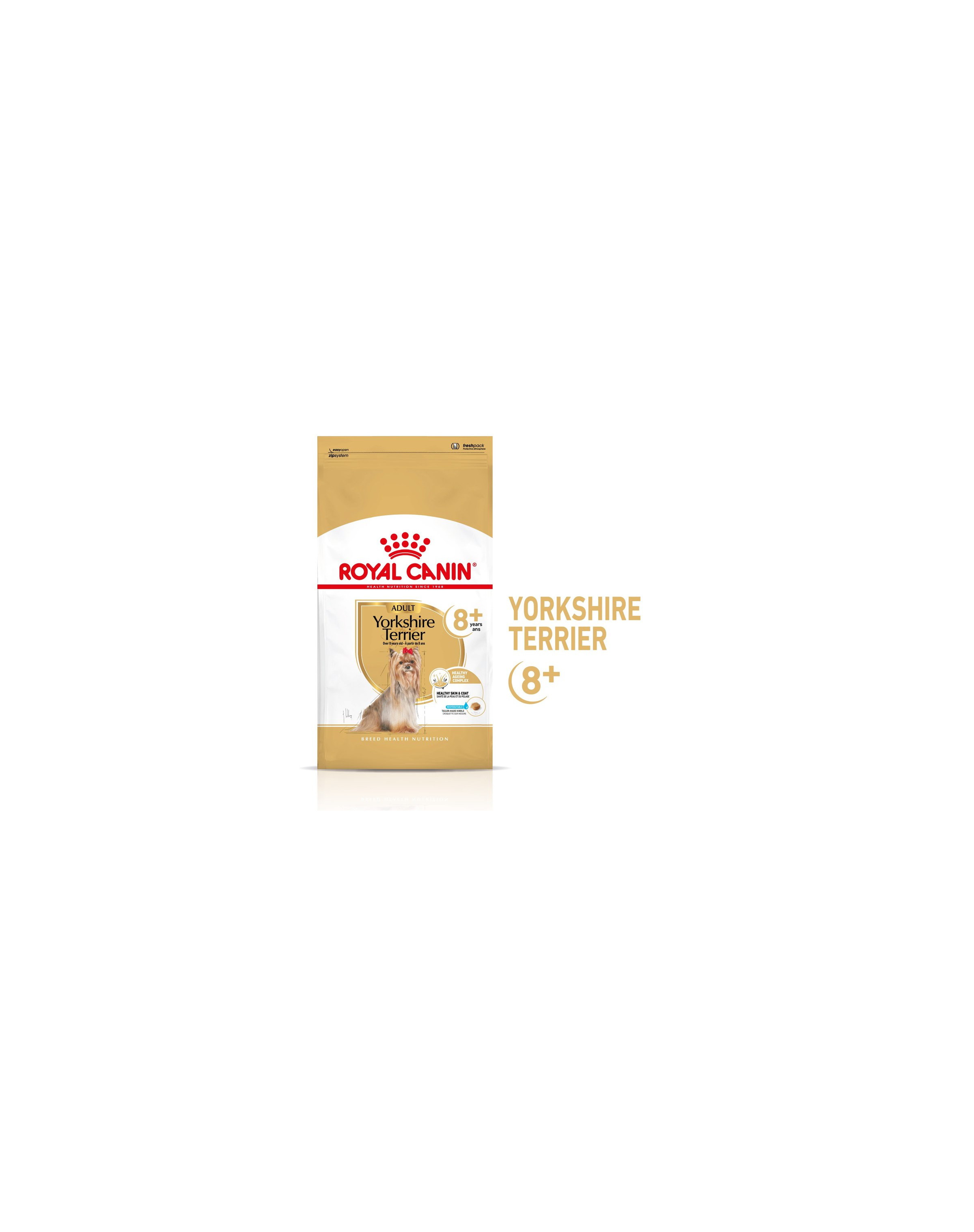 Yorkshire Terrier, eller Yorkies, är balanserade, aktiva och intelligenta hundar fulla av energi och entusiasm. Den lilla terriern är ivrig att lära sig, lekfull och självsäker. Alla hundraser har olika behov. Näringen bör ta hänsyn till detta för att stödja optimal hälsa i varje skede av livet. ROYAL CANIN Yorkshire Terrier Adult 8+ är lämpligt för Yorkshire Terrier från 8 års ålder och har utvecklats speciellt för att stödja en hälsosam åldrandeprocess hos Yorkshire Terrier. Ett speciellt antioxidantkomplex kan bidra till att skydda cellerna. Det anpassade fosforinnehållet kan bidra till att upprätthålla njurhälsan hos äldre Yorkshire Terrier.