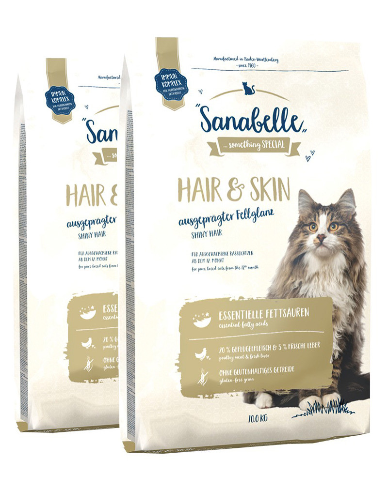 Sanabelle Hair & Skin är ett helfoder för vuxna katter speciellt utvecklat för att förbättra pälsegenskaperna. De höga halterna av värdefulla oljor och fetter kan säkerställa en elegant, glänsande och smidig päls (glänsande hår). Kombinationen av vitaminer och spårämnen som används i Sanabelle Hair & Skin stöder också den positiva effekten på hud och hår och är därför särskilt lämplig för din stamtavla katt.