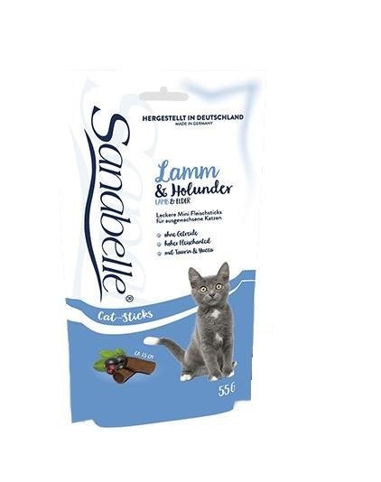 Sanabelle Cat Sticks Lamb & Elderberry är kortskurna, spannmålsfria sticks med mycket hög kötthalt (92,5 %, varav minst 20 % färsk kyckling, 8 % lamm) och torkade fläderbär (1 %).