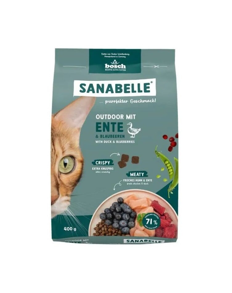 Sanabelle Outdoor med anka är ett fullvärdigt foder som är speciellt framtaget för utekatter och aktiva katter vars energibehov är högre än för innekatter. Formulan innehåller lättsmält anka samt extra portioner protein och fett som stödjer energi, uthållighet och hälsa under varierande förhållanden. Den balanserade sammansättningen, rik på vitaminer och spårämnen, bidrar till immunförsvaret, ämnesomsättningen och en frisk päls.