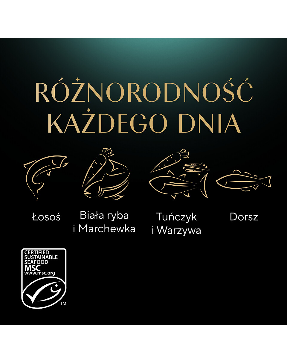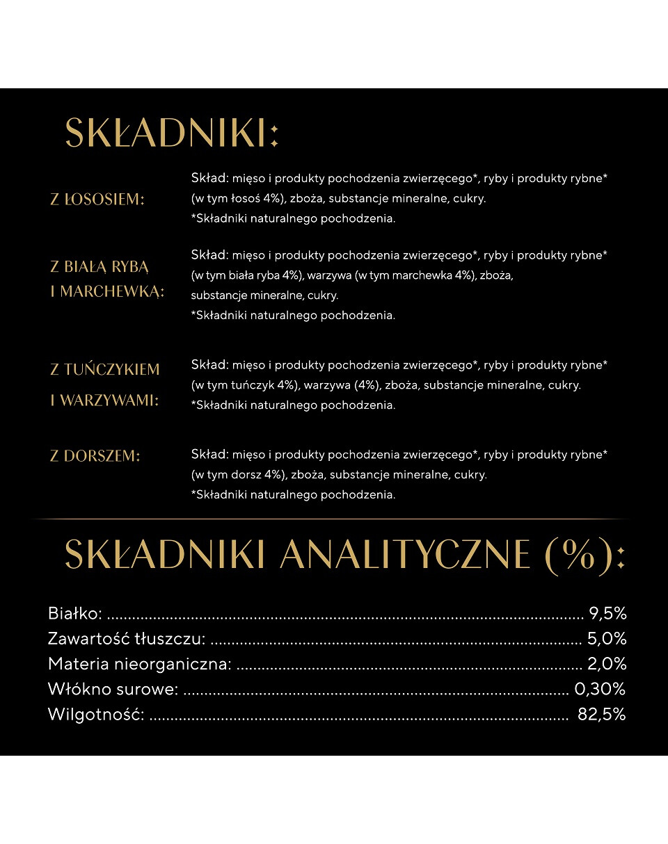 Med vit fisk och morot. Ingredienser: kött och animaliska biprodukter*, fisk och fiskprodukter* (inklusive vit fisk 4%), grönsaker (inklusive morot 4%), spannmål, mineralämnen, sockerarter. *Naturliga ingredienser.