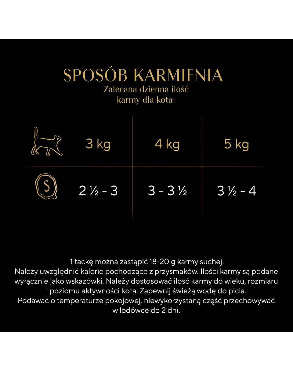riktlinjer. Justera mängden foder efter kattens ålder, storlek och aktivitetsnivå. Se till att det finns färskt vatten tillgängligt. Servera vid rumstemperatur, och förvara oanvänd del i kylskåp i upp till 2 dagar.