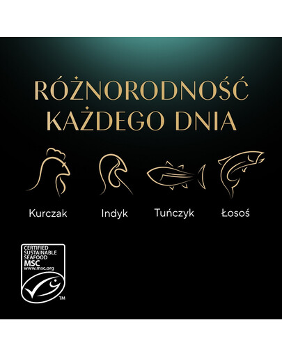 Bitar med kalkon med morot och ärtor: Ingredienser: kött och animaliska biprodukter* (94% av naturligt ursprung; varav 4% kalkon i bitar**), växtbaserade produkter*, grönsaker* (varav blandning av torkad morot och ärtor 1%, vilket motsvarar en innehåll av blandning av morot och ärtor på 5,6%), mineralämnen, jäst*, socker. *Ingredienser av naturligt ursprung. **Bitar utgör 43% av produkten.