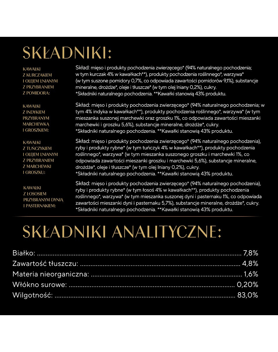 Bitar med lax med pumpa och palsternacka: Ingredienser: kött och animaliska biprodukter* (94% av naturligt ursprung), fisk och fiskprodukter* (varav lax 4% i bitar**), växtbaserade produkter*, grönsaker* inklusive blandning av torkad pumpa och palsternacka 1%, vilket motsvarar en innehåll av blandning av pumpa och palsternacka på 5,7%), mineralämnen, jäst*, socker. *Ingredienser av naturligt ursprung. **Bitar utgör 43% av produkten.