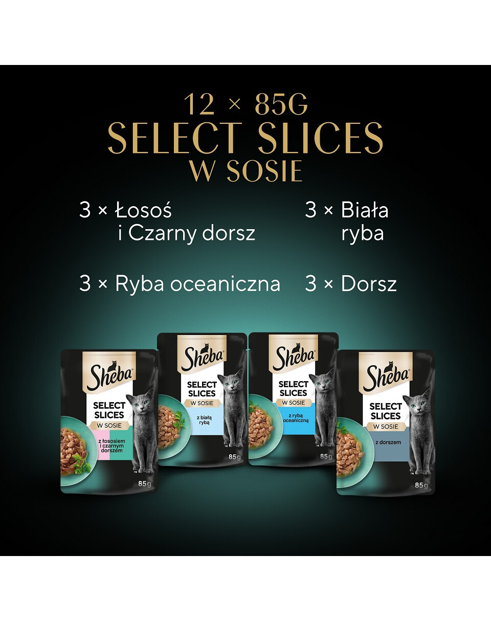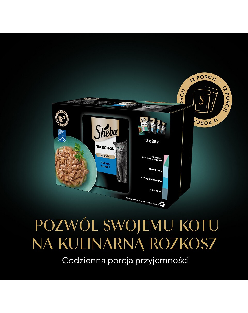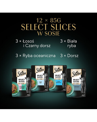 Sheba Selection Fisk Smaker är en blandning av noggrant utvalda, delikata bitar i en utsökt sås. Måltidsförslaget finns i 4 smakvarianter, bitar med: lax och svart torsk, vit fisk, havsfisk, torsk, som kommer att glädja även de mest kräsna katternas smaklökar. Hemligheten bakom den mästerliga receptet Sheba Selection Fisk Smaker är högkvalitativa naturliga ingredienser samt vitaminer och mineraler. Varje påse innehåller näringsämnen som stödjer din katts korrekta funktion. Låt din katt njuta av kulinariska läckerheter med den utsökta Sheba Selection Fisk Smaker, som tillfredsställer även den mest kräsna aptiten.
