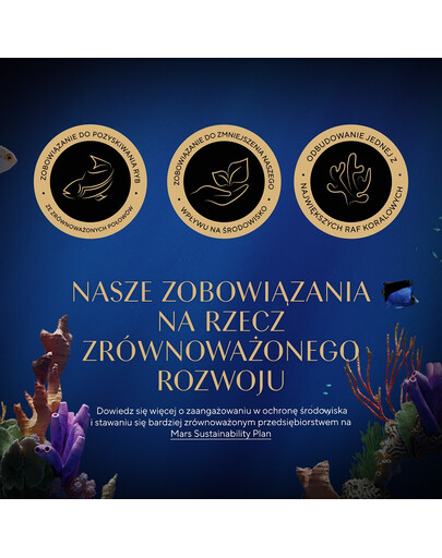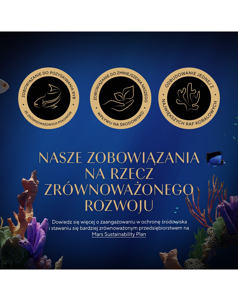 Bitar med havsfisk: Ingredienser: kött och animaliska biprodukter* (93% naturligt ursprung), fisk och fiskprodukter* (inklusive havsfisk 4% i bitar**), växtbaserade produkter, spannmål, mineralämnen, sockerarter. *Ingredienser av naturligt ursprung. **Bitar utgör 43% av produkten.