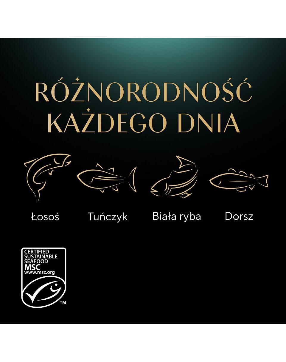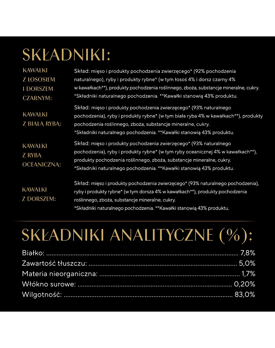Bitar med lax och svart torsk: Ingredienser: kött och animaliska biprodukter* (92% naturligt ursprung), fisk och fiskprodukter* (inklusive lax 4% och svart torsk 4% i bitar**), växtbaserade produkter, spannmål, mineralämnen, sockerarter. *Ingredienser av naturligt ursprung. **Bitar utgör 43% av produkten.