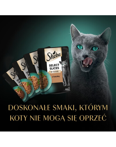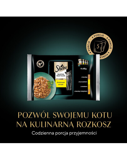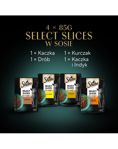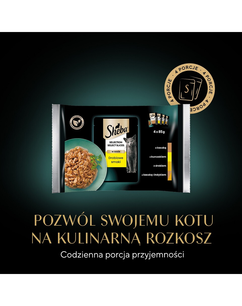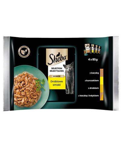 Sheba Selection Fjäderfäsmaker är en blandning av noggrant utvalda, ömma bitar i en utsökt sås. Måltidsförslaget finns i 4 smakvarianter, bitar med: anka, kyckling, fjäderfä, anka och kalkon kommer att glädja även de mest kräsna katterna. Hemligheten bakom den mästerliga receptet Sheba Selection Fjäderfäsmaker är högkvalitativa naturliga ingredienser samt vitaminer och mineraler. Varje påse innehåller näringsämnen som stödjer din katts korrekta funktion. Låt din katt njuta av kulinariska läckerheter med den utsökta Sheba Selection Fjäderfäsmaker, som tillfredsställer även den mest kräsna aptiten.