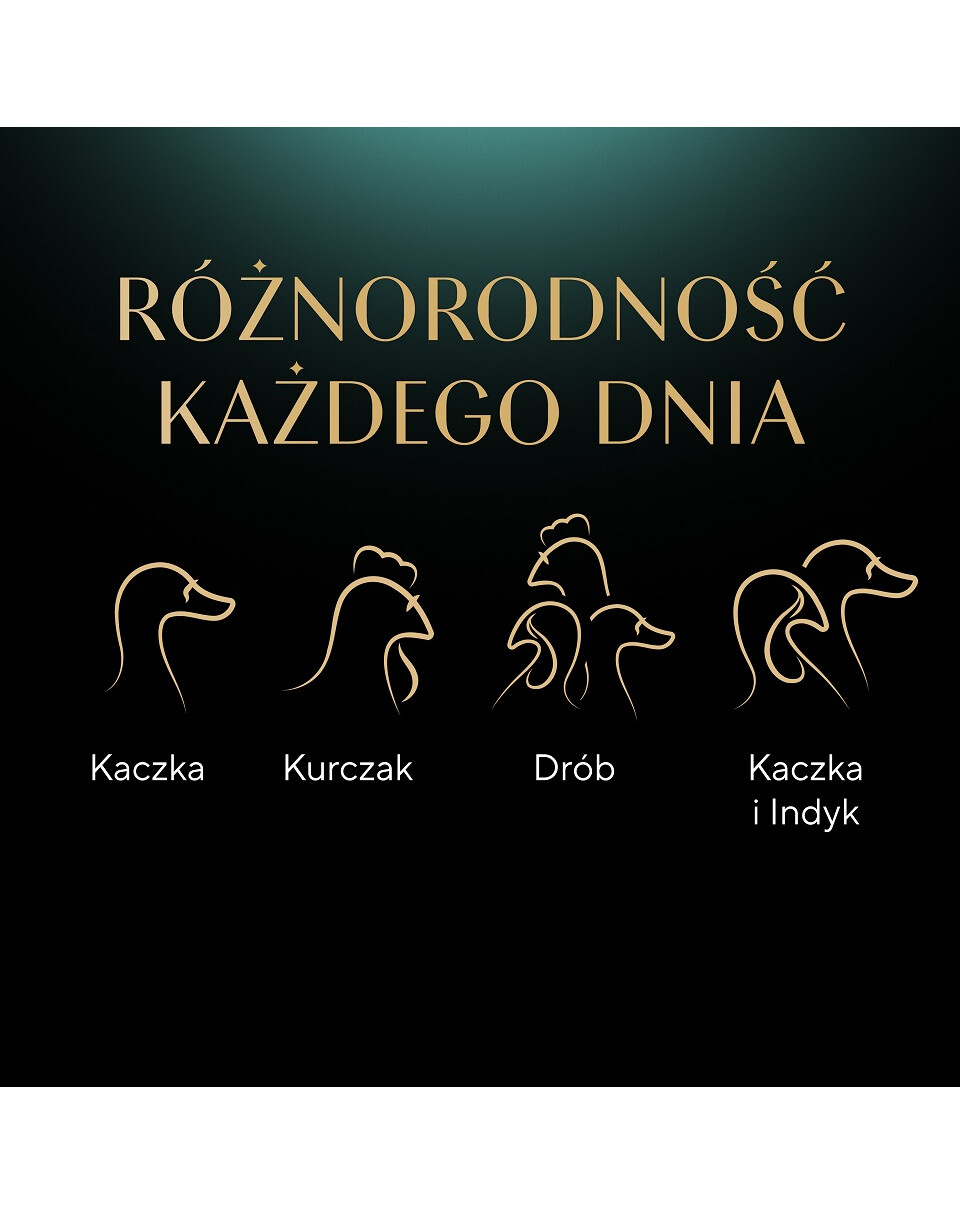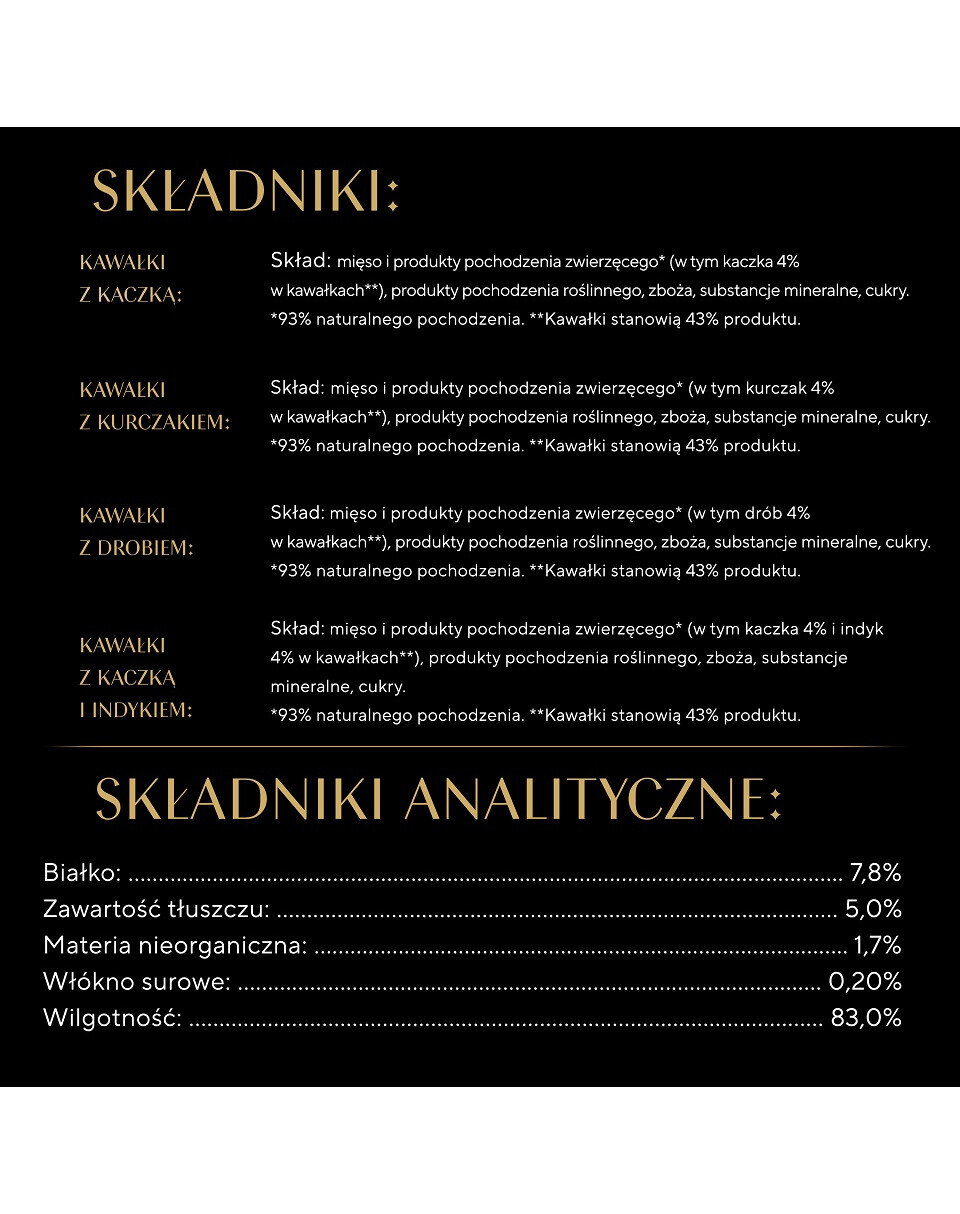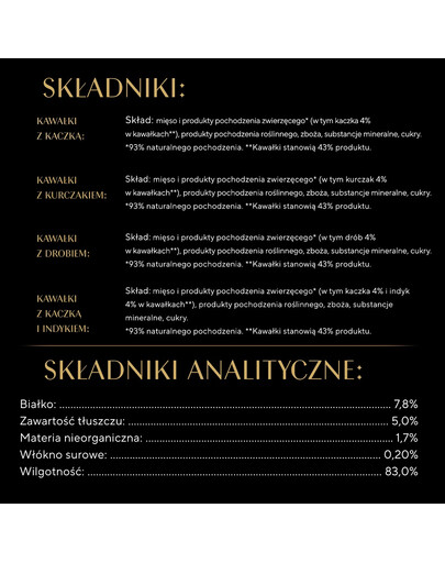 Bitar med anka och kalkon: Innehåll: kött och animaliska biprodukter* (inklusive anka 4% och kalkon 4% i bitar**), växtbaserade produkter, spannmål, mineralämnen, sockerarter. *93% av naturligt ursprung. **Bitar utgör 43% av produkten.