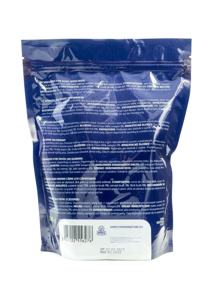 Sammansättning: hjortkött 98%, ärtfiber 2%.