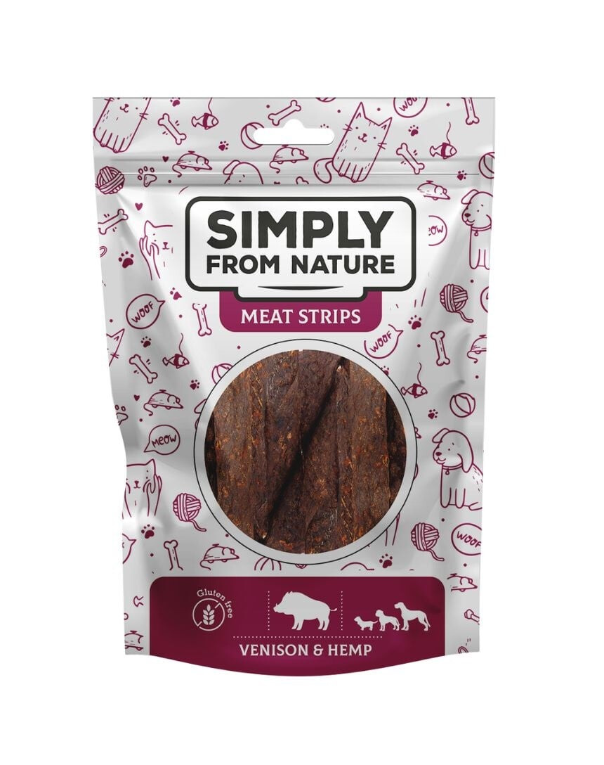 Glutenfri kombination av vilt och hampa är avsedd för alla hundar. Viltkött är en mineralrik och energirik köttkälla som ger vitalitet och näring till hundens kropp. Hampa har antiinflammatoriska egenskaper och lugnar nervsystemet. Kombinationen är särskilt smaklig och tack vare torkningsprocessen också hälsosam och naturlig! Godbitarna förlorar inte sina näringsvärden, och den enkla ingredienslistan garanterar hög kvalitet. Meat Strips innehåller inga konserveringsmedel, färgämnen eller aromer.