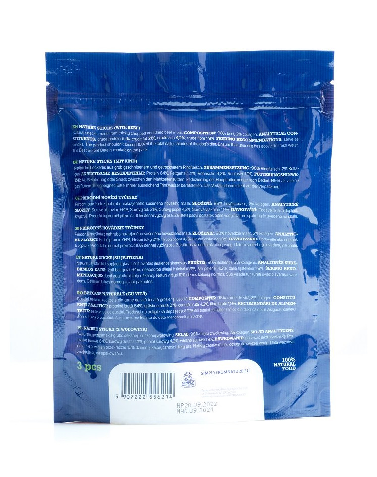 Nötkött är en bra källa till järn, B-vitaminer och L-karnitin - en ingrediens som påskyndar ämnesomsättningen. Tack vare den ätbara kollagenbeläggningen är produkten krispig. Kollagen är ansvarigt för att skelettsystemet fungerar korrekt. Det fördröjer åldrandeprocessen och hjälper till att upprätthålla ett bra hudtillstånd. Nötköttscigarrer innehåller mycket protein med låg fetthalt. Kollagenhöljet är en naturlig produkt som är helt lättsmält. Det gör det möjligt att hålla godisbitarna i en viss form och är också gott för hundar.