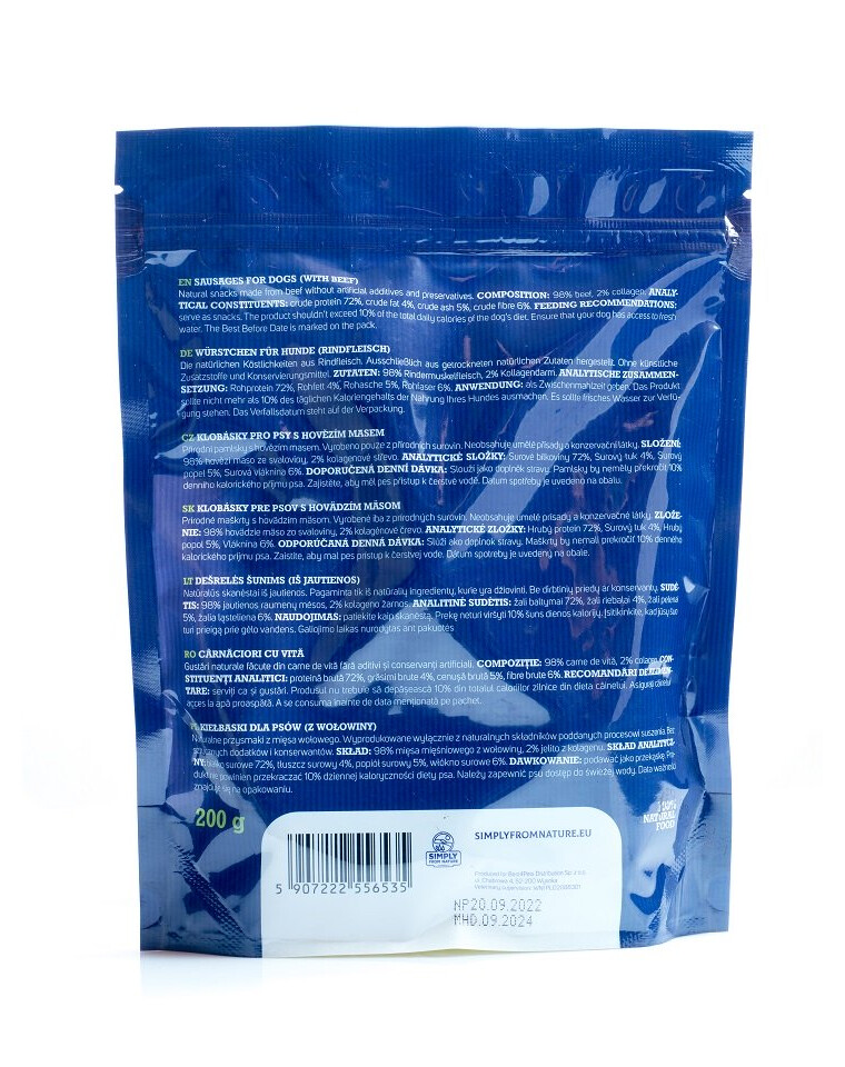 Nötkött innehåller mycket protein och lite fett. Sådana snacks smakar inte bara bra och ger variation i den dagliga kosten, utan är också näringsrika och ger hunden energi. Kollagenhöljet är en naturlig, helt smältbar produkt.