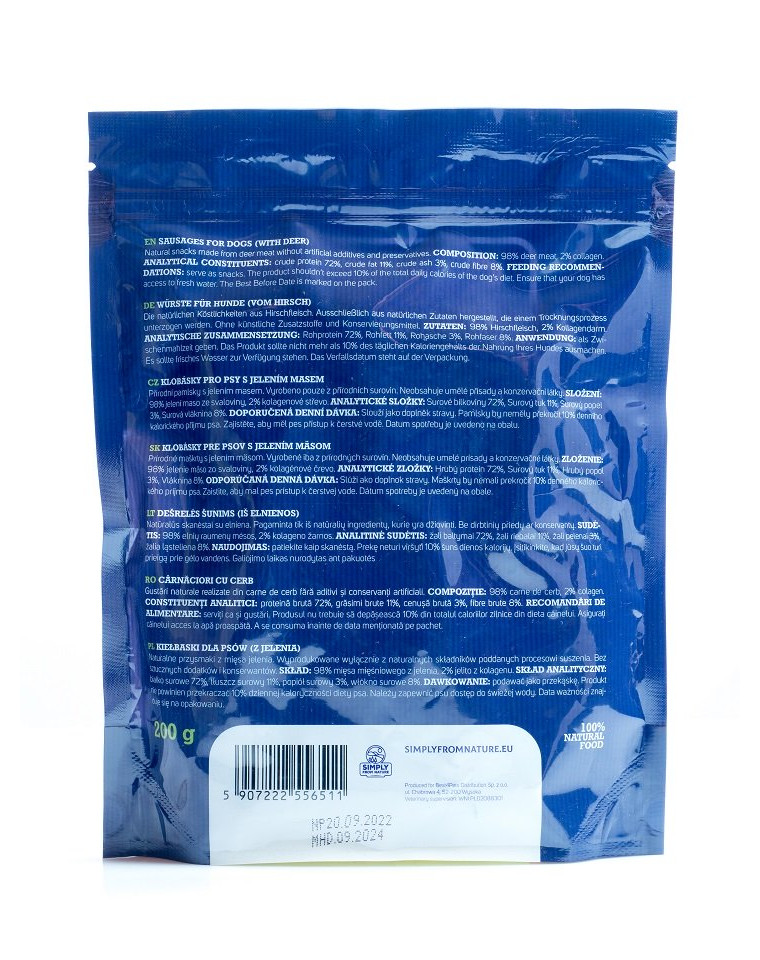 Grovhackat kött är mycket frestande och din hund kan bita i det. Den enda bearbetningen av korven är torkning. Detta gör att de ursprungliga ingredienserna i de enskilda ämnena och produktens smak kan bevaras. En proteinkälla av animaliskt ursprung gör det möjligt att anpassa korvens smak till hundar med allergier. Dessutom kan de ges under en eliminationsdiet. Produkten är också lämplig för hundar med känslig matsmältning, eftersom den endast innehåller naturliga och väl tolererade ingredienser.