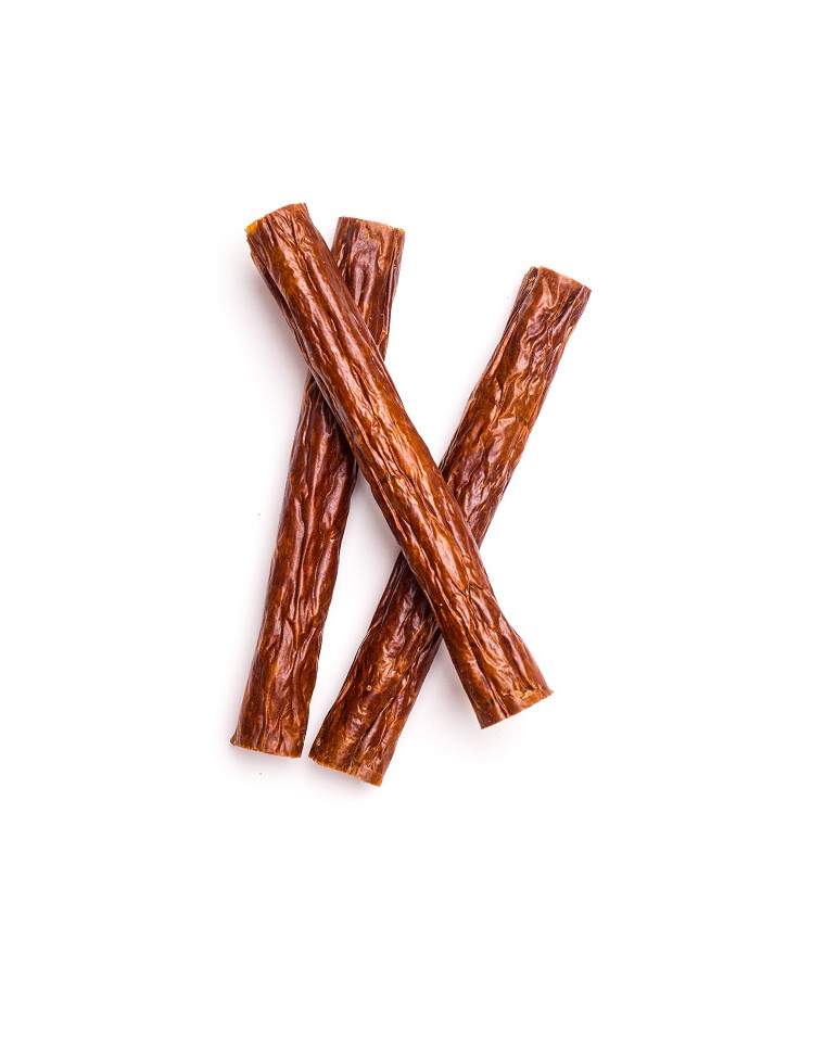 Tack vare den ätbara kollagenbeläggningen är produkten krispig. Kollagen är ansvarigt för att skelettsystemet fungerar korrekt. Det fördröjer åldringsprocessen och bidrar till att upprätthålla ett gott hudtillstånd. Kollagenhöljet är en naturlig produkt som är helt lättsmält. Det gör det möjligt att hålla godisbitar i en viss form och smakar dessutom gott för hundar. Torkning - avdunstning av vatten från produkten säkerställer kondenserade näringsämnen. Cigarrer kan ges som en helhet, som en perfekt variation i hundens kost och som en hälsosam behandling. Samtidigt är det lätt att dela dem i mindre bitar och använda dem som fyllning i leksaker och som träningsgodis. Det grovhackade och torkade köttet är extremt gott och intressant för de flesta hundar, eftersom hundar är biologiskt anpassade och har köttätande instinkter. Storleken på cigarren har anpassats till hundkäkarnas möjligheter, från den lilla till den stora rasen.