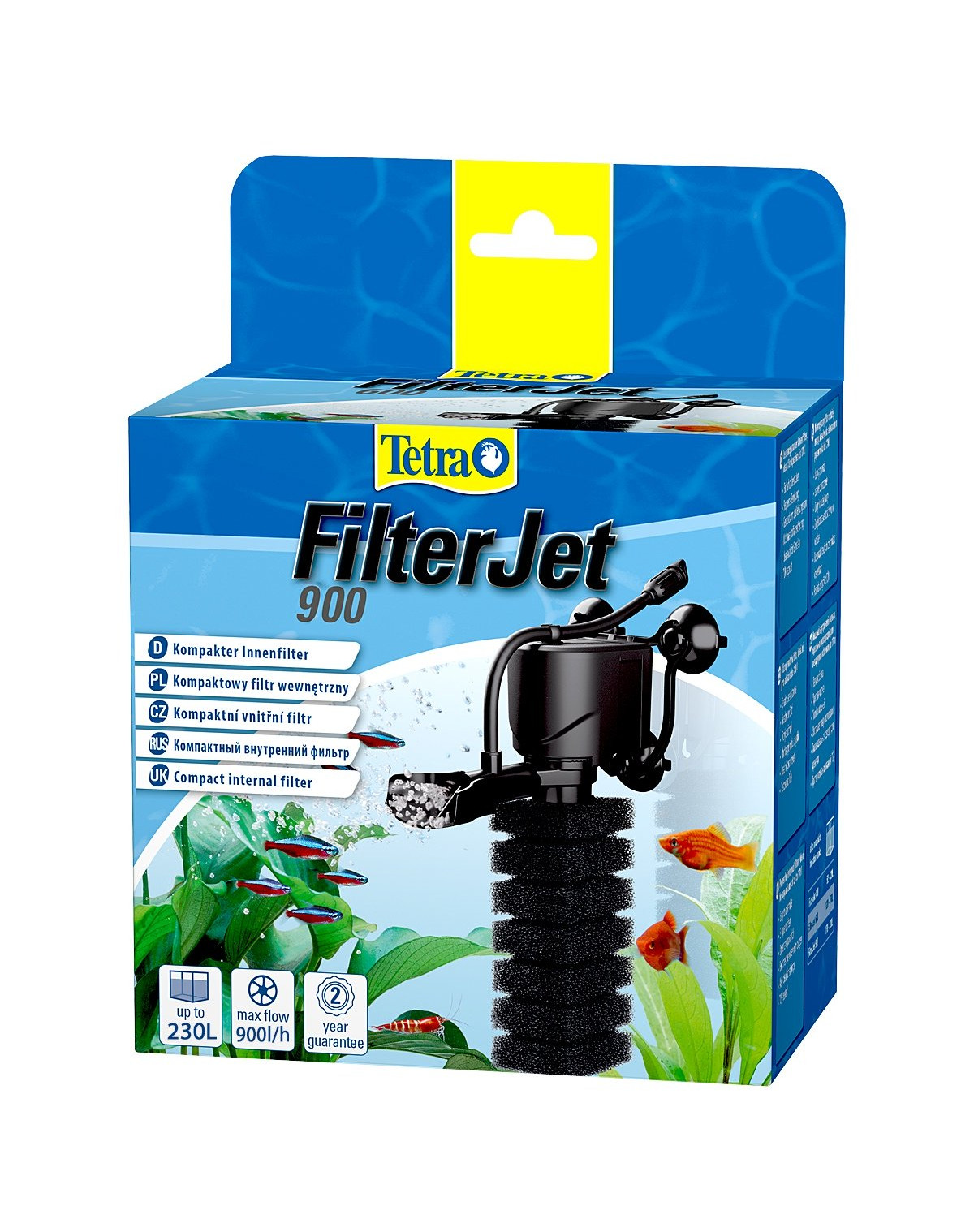 Det kraftfulla Tetra FilterJet akvariefiltret är lämpligt för akvarier med en volym på 50 - 230 liter och rengör dem särskilt noggrant tack vare kombinationen av mekanisk och biologisk filtrering. På så sätt avlägsnas både grova och Vom feinsten smutspartiklar från akvarievattnet samtidigt som den biologiska balans som krävs för ett intakt akvarium uppnås. Den mekaniska filtreringen renar vattnet från grov smuts, t.ex. kan även mulm från underlaget sugas in, och suspenderat material som alger och döda växtdelar. Viktigare är dock de nitrifierande filterbakteriernas uppgift. De nyttiga bakterierna sätter sig på substraten i filtret och bryter ner skadlig ammoniak och nitrit till nitrat. Detta är en del av den biologiska filtreringen och den naturliga nedbrytningsprocessen i akvariet. Det interna filtret imponerar också med sin tysta drift. Tack vare den enkla installationen är Tetra FilterJet klar att användas på bara några sekunder. Det justerbara utloppsmunstycket möjliggör optimal kontroll av vattencirkulationen så att hela akvariet luftas jämnt. En annan fördel med det interna akvariefiltret Tetra FilterJet är att filtersvampen är enkel att rengöra. Detta minskar avsevärt tiden för underhåll av filtret. Filtermaterialet ska inte rengöras med varmt vatten. Det skulle skada de nyttiga filterbakterierna som koloniserar filtret. Kemiska medel får heller aldrig användas för rengöring. För att skydda populationen av filterbakterier på lång sikt rekommenderas att filterrengöring och partiella vattenbyten inte utförs samtidigt.