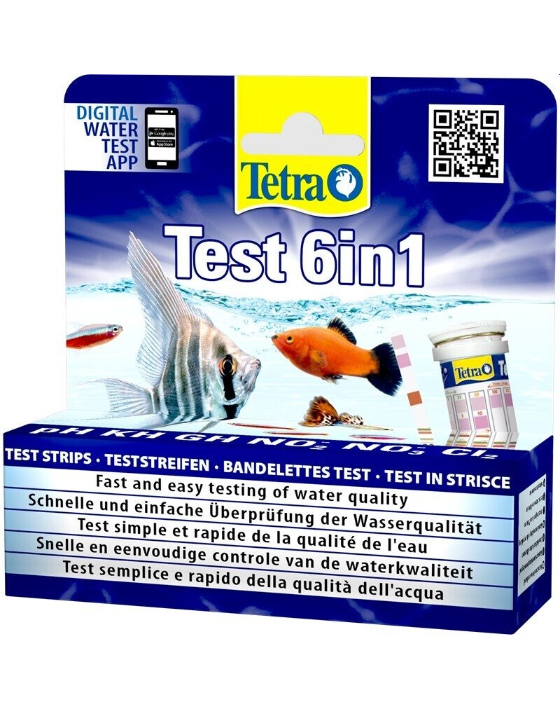 Med Tetras teststickor kan du snabbt och tillförlitligt bestämma de sex viktigaste vattenvärdena i akvariet i ett enkelt steg: Doppa teststickorna i vattnet, låt dem virvla i vattnet i en till två sekunder, skaka av vattnet och läs av den viktigaste informationen om vattenvärdena efter bara 60 sekunder. Med hjälp av färgskalan kan man avgöra om vattenvärdena ligger inom det säkra området. I akvarievattnet mäts pH-värdet, total- och karbonathårdheten (GH + KH), nitrit- (NO2), nitrat- (NO3) och klorhalten (Cl2). Akvarieinvånare som fiskar reagerar mycket känsligt på stora förändringar i pH-värdet, eftersom det påverkar de levande organismernas välbefinnande. Den totala hårdheten påverkar fiskarnas vitala funktioner, medan KH-värdet har en direkt inverkan på pH-värdets stabilitet ("pH-buffert"). Teststickorna mäter även nitrit- och nitrathalterna i akvarievattnet. Nitrit är mycket skadligt även i låga koncentrationer och bör därför inte kunna påvisas i vattnet. Nitrat används av växter som ett näringsämne för deras tillväxt. För höga koncentrationer av NO3- kan dock vara skadliga för fiskar och främja kraftig algtillväxt. Ett annat ämne som kan förekomma i vattnet är klor. Klor är skadligt för fiskar och växter. Precis som nitrit ska klor därför inte kunna detekteras i akvarievatten. Med Tetra Aquatics-appen kan vattenvärdena också bestämmas snabbt och säkert via smarttelefonen.