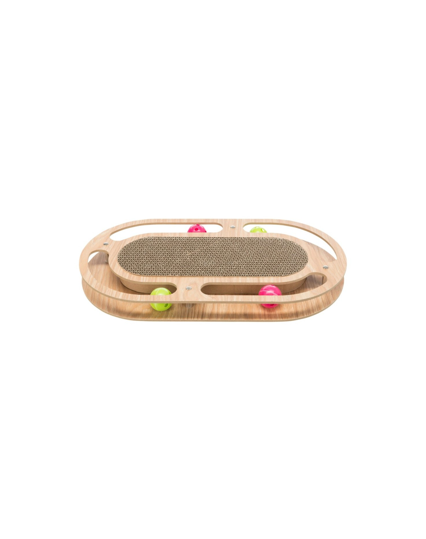 Klätterställning av kartong med träram och leksaker.