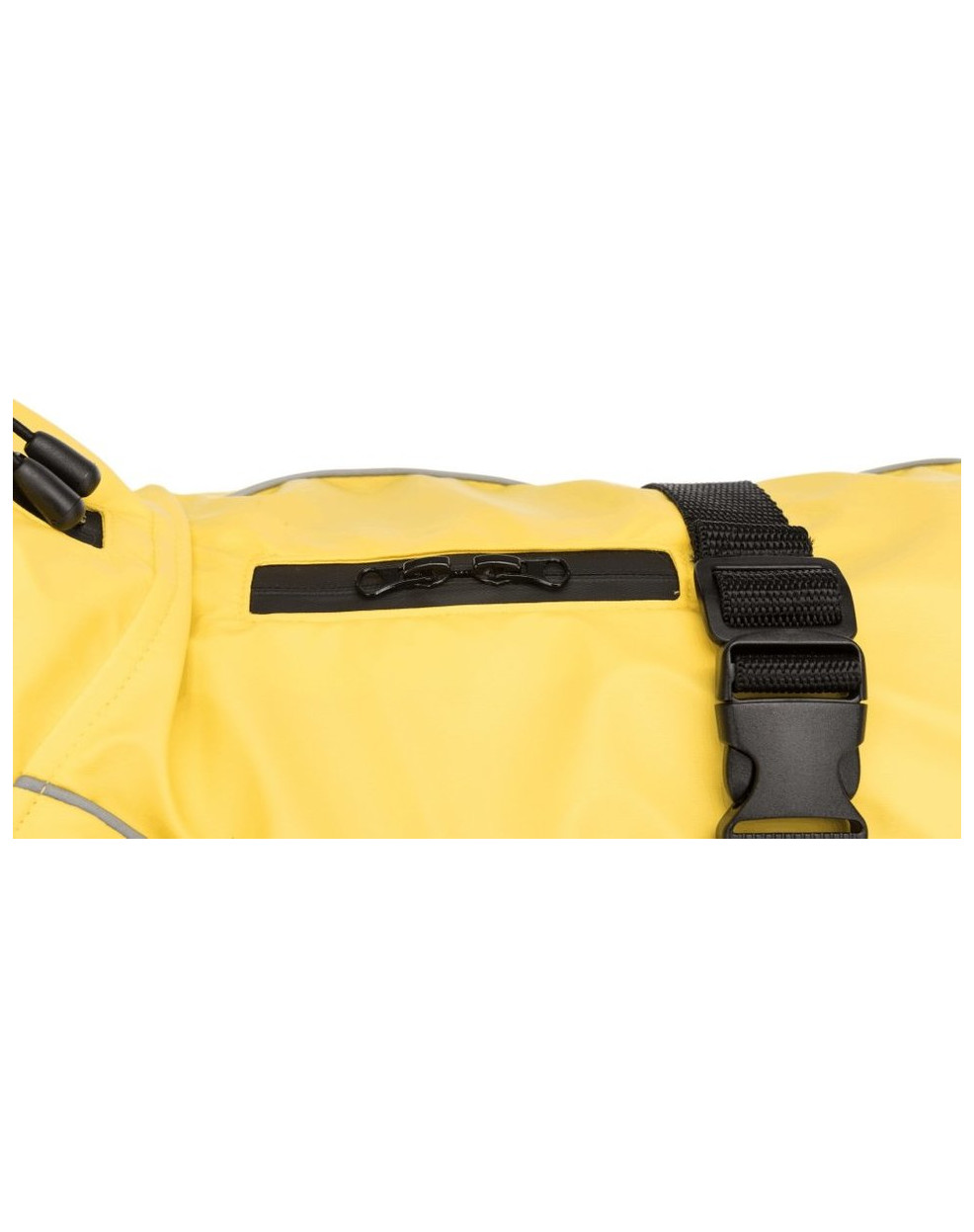 Mackintosh för din hund, tillverkad av polyester. Kappan har två vattentäta dragkedjor, du kan fästa den i selen. Den är vind- och regntät. Det finns ett spänne på magen för justering. Hög krage skyddar mot regn. Reflekterande element är ett extra skydd under en promenad.