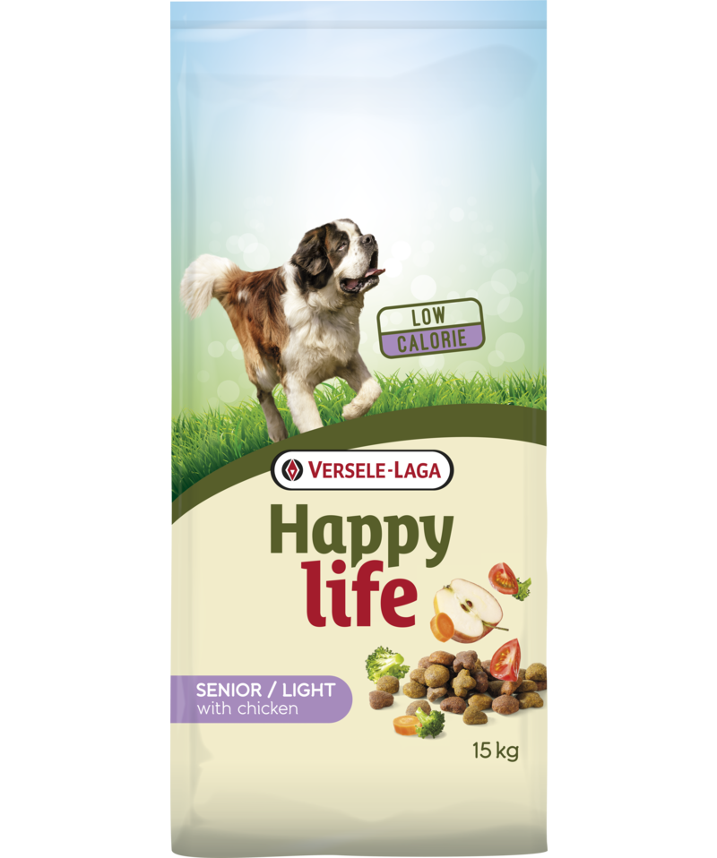 Happy life Senior/Light med kyckling är ett smakligt och varierat lågenergifoder med kyckling som innehåller alla näringsämnen för en äldre eller överviktig vuxen hund