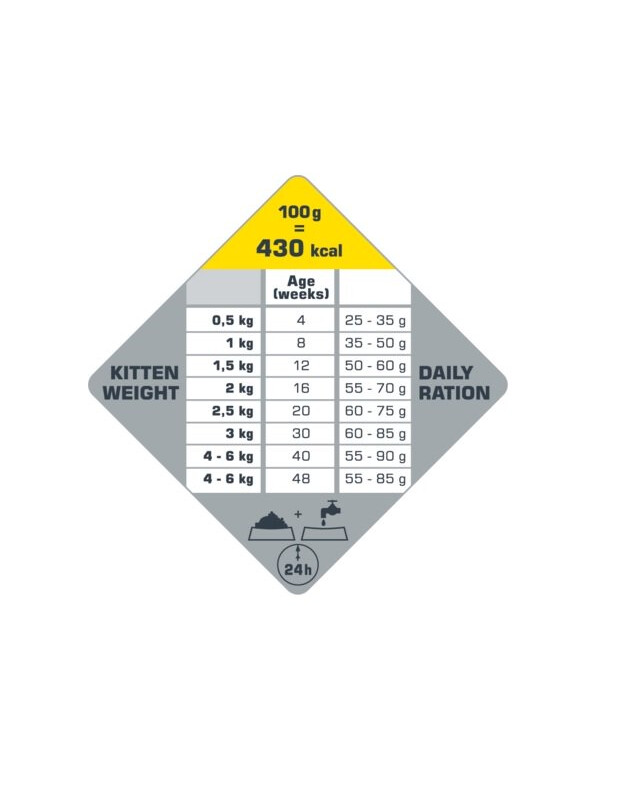 Opti Life Kitten stödjer optimal utveckling av skelettet, hjärnan och synen hos kattungar tack vare kalcium, fosfor, laxolja (en Nature-källa till omega-3-fettsyrorna EPA och DHA) och taurin.