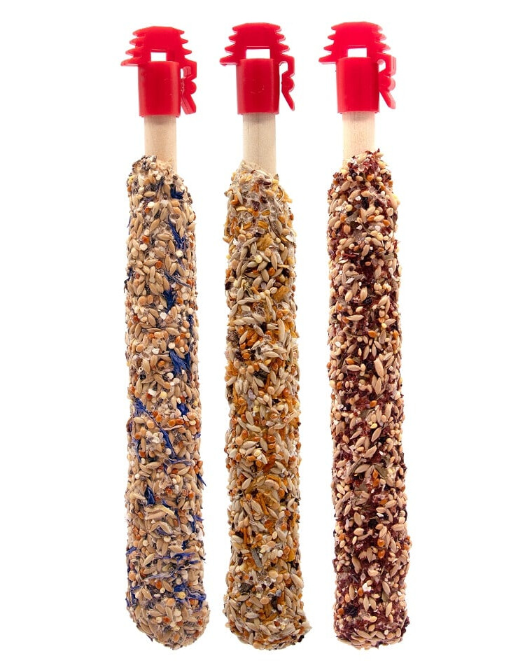 Prestige Sticks Canaries Triple Variety Pack 90g är 3 rostade kolvar (frön och blommor, fruktblandning och maskros, röda bär och mynta) för kanariefåglar. De utgör ett naturligt, fullvärdigt snacks och komplement till den dagliga kosten.
