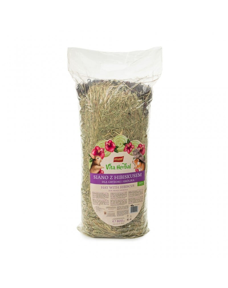 Högkvalitativa, doftande, noggrant torkade premium gräslöv, rika på vitaminer och mineraler, direkt från polska ängar. Hö är en lågkalorimat med hög fiberhalt som stör det normala matsmältningsprocessen hos djuret. Den bästa kosten för gnagare och kaniner bör ge konstant tillgång till denna typ av föda. Nu med tillsats av torkade hibiskusblommor. Hibiskus, som innehåller stora mängder vitamin C, har också antibakteriella egenskaper, stödjer leverns funktion och matsmältningsprocesserna.