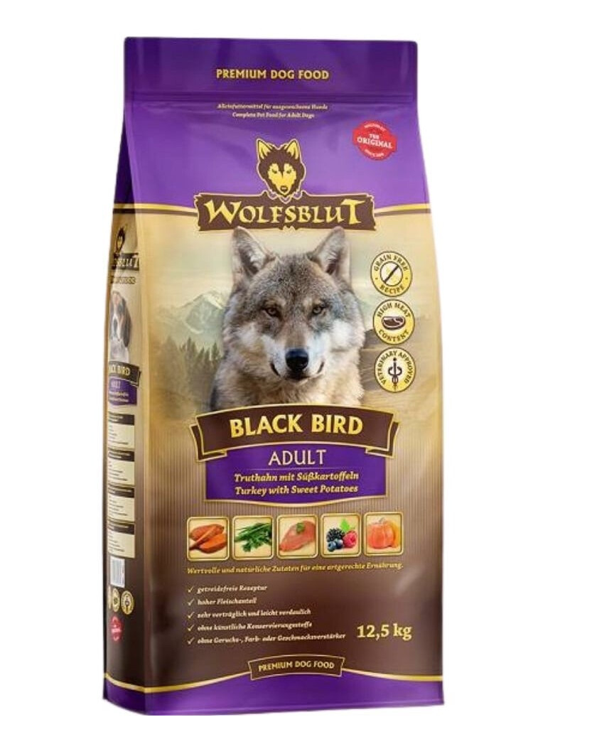WOLFSBLUT BLACK BIRD ADULT komplett torrfoder för vuxna hundar med kalkon, där förfäders näring förenas med moderna behov hos din hund. Tack vare detta kan din hund njuta av naturlig och lämplig näring varje dag.