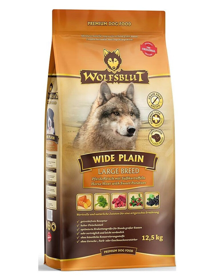WOLFSBLUT WIDE PLAIN LARGE BREED komplett torrfoder för vuxna hundar med hästkött, där traditionell näring förenas med moderna behov hos din hund. Detta gör att hunden kan njuta av naturlig och lämplig näring varje dag.
