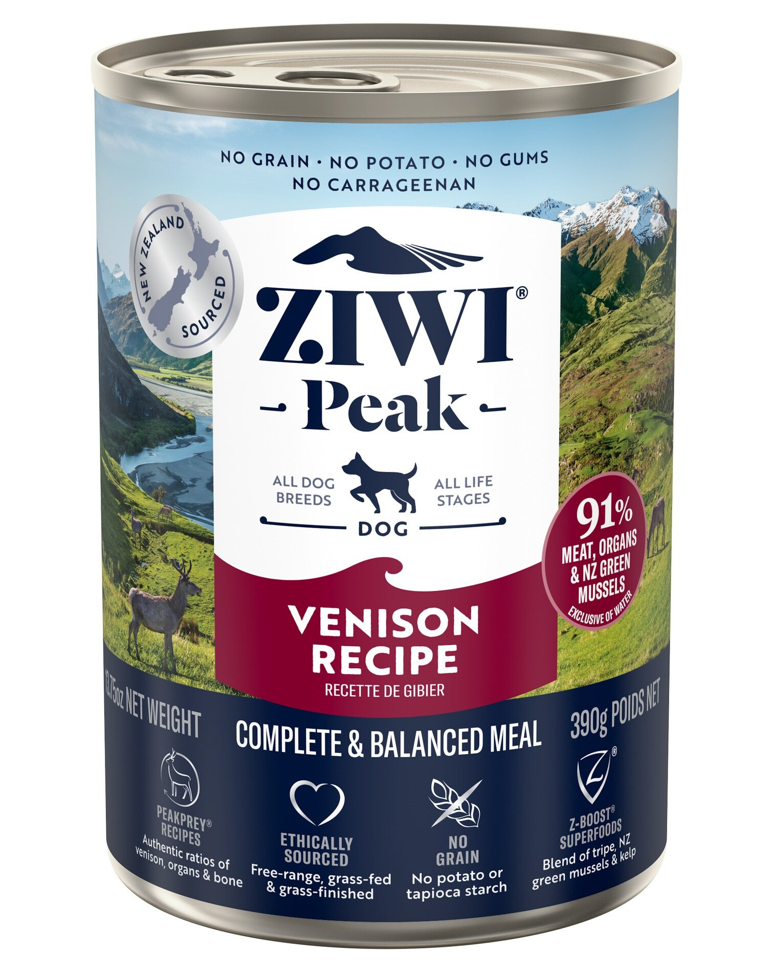 Hjort och slaktbiprodukter från hjort (86 % kött, våm, lever, lungor, hjärta, njurar, ben), kikärter, grönläppad mussla från Nya Zeeland, lecitin, mineraler och vitaminer, torkad tång.